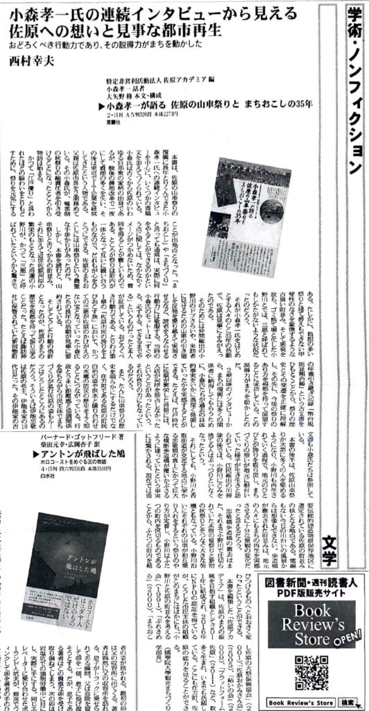 図書新聞(2023年7月8日号)の書評に、学術・ノンフィクション分野で「小森孝一が語る 佐原の山車祭りと まちおこしの35年(2023年3月刊)」が掲載されました。