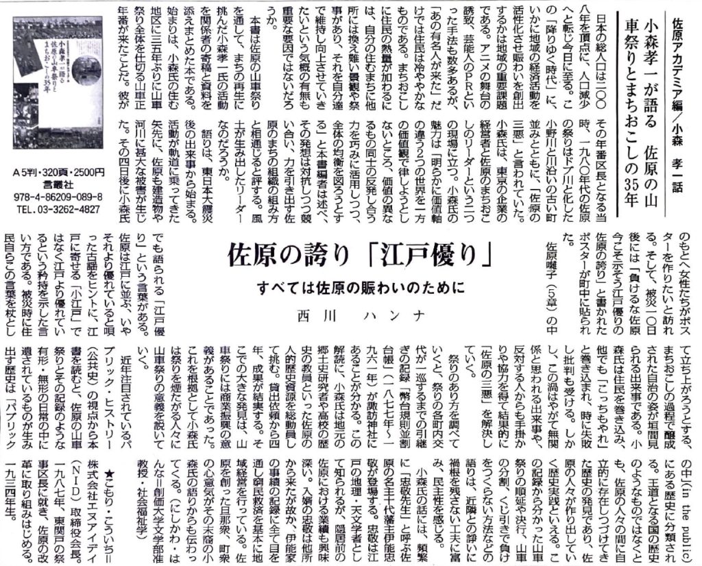 週刊読書人(2023年5月26日号)の書評に、「小森孝一が語る 佐原の山車祭りと まちおこしの35年(2023年3月刊)」が掲載されました。